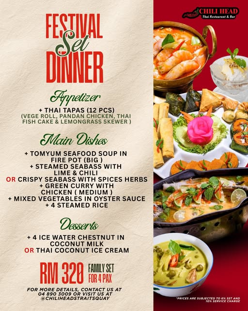 Gather the family and celebrate together with our Festival Set Dinner, specially curated for sharing and festive moments. From Thai tapas and a hearty Tom Yum Seafood Fire Pot, to flavourful seabass, fragrant green curry, and refreshing Thai desserts, everything you need for a complete Thai feast is in one set.